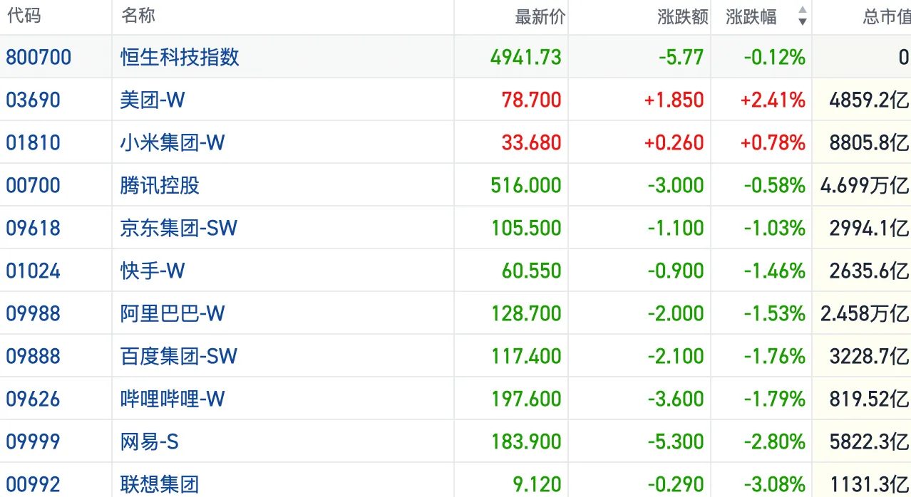 盘面上,大型科网股走势分化,其中,美团涨2.4%,小米涨近1%,腾讯跌幅在0.6%以内。网易、阿里、快手飘绿。