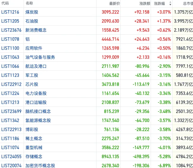 上涨的板块中,能源方向仍是短线最为吸金的热点,石油、煤炭股全天强势。此外,AI应用、新消费等概念也有所上涨。